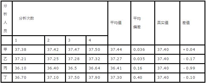由上表看出,甲所得結(jié)果準確度和精密度均好,結(jié)果可靠。乙的精密度雖好,但準確度不太好。丙的精密度與準確度均差。丁的平均值雖接近真實值,但幾個數(shù)據(jù)分散性大,精密度太差,僅是由于大的正負誤差相互抵消才使結(jié)果接近真實值。